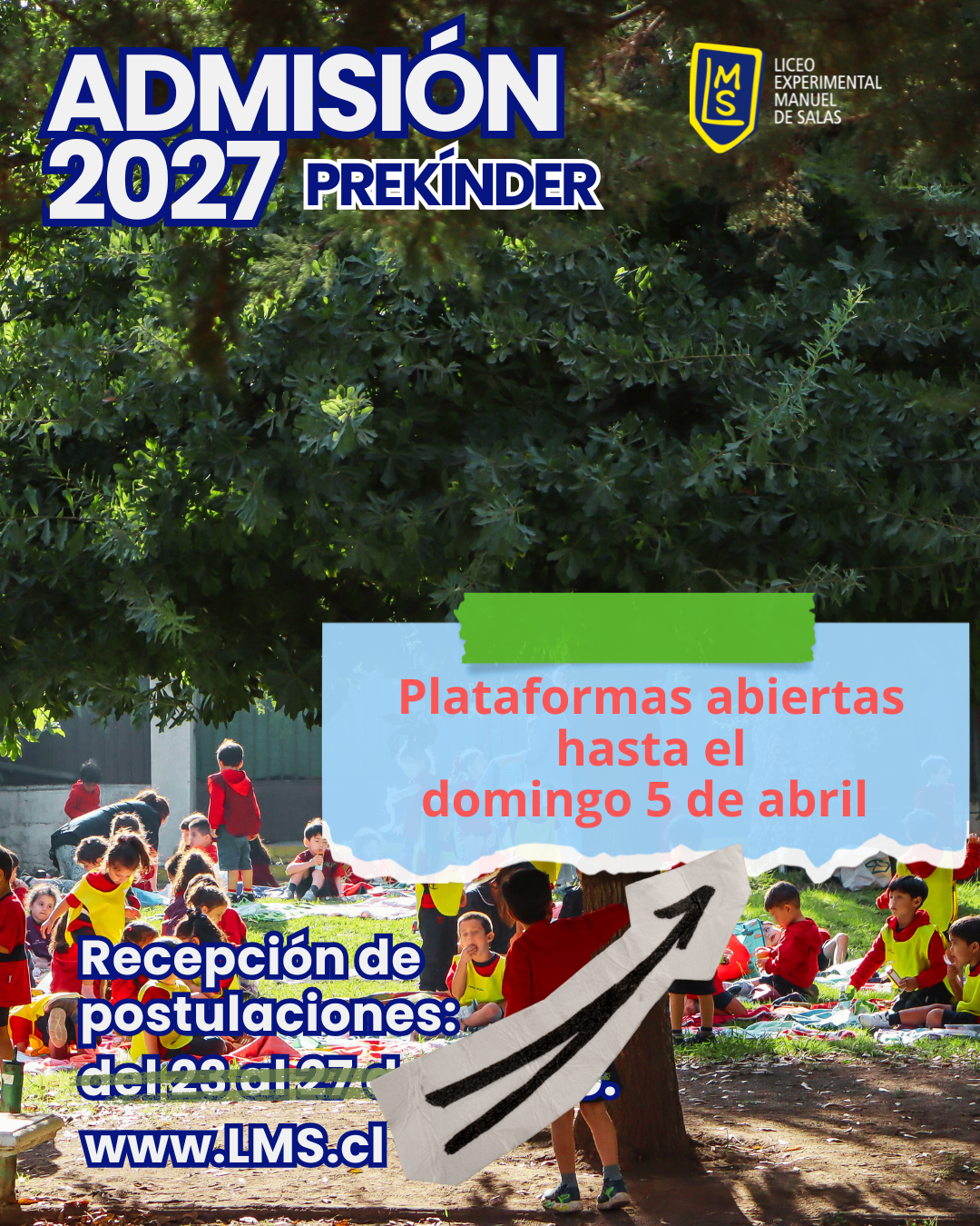 El Equipo Directivo del Liceo Experimental Manuel de Salas informa a la comunidad que, debido al alto flujo de visitas que generaron dificultades en el funcionamiento de las plataformas institucionales de Admisión, se extendió hasta el domingo 5 de abril el proceso de recepción de antecedentes de los y las postulantes al nivel de Transición Menor (prekínder) para el año académico 2027.