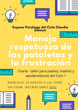 Durante el encuentro, que será de carácter expositivo, habrá espacio para actividades reflexivas, resolver preguntas y tiempo para «compartir respecto de las propias estrategias de manejo de las pataletas y la frustración, para que entre todos y todas podamos construir nuevas formas de criar» puntualizó la Psicóloga de Ciclo 1.