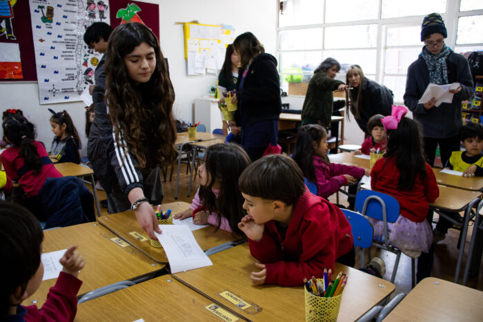 Durante la jornada del miércoles 3 de septiembre, estudiantes del I° Medio D visitaron a sus pares de Educación Parvularia, para realizar una actividad de sensibilización con los cursos de Transición Menor y Transición Mayor en torno al proyecto “Sembrando huellas, pintando sueños”